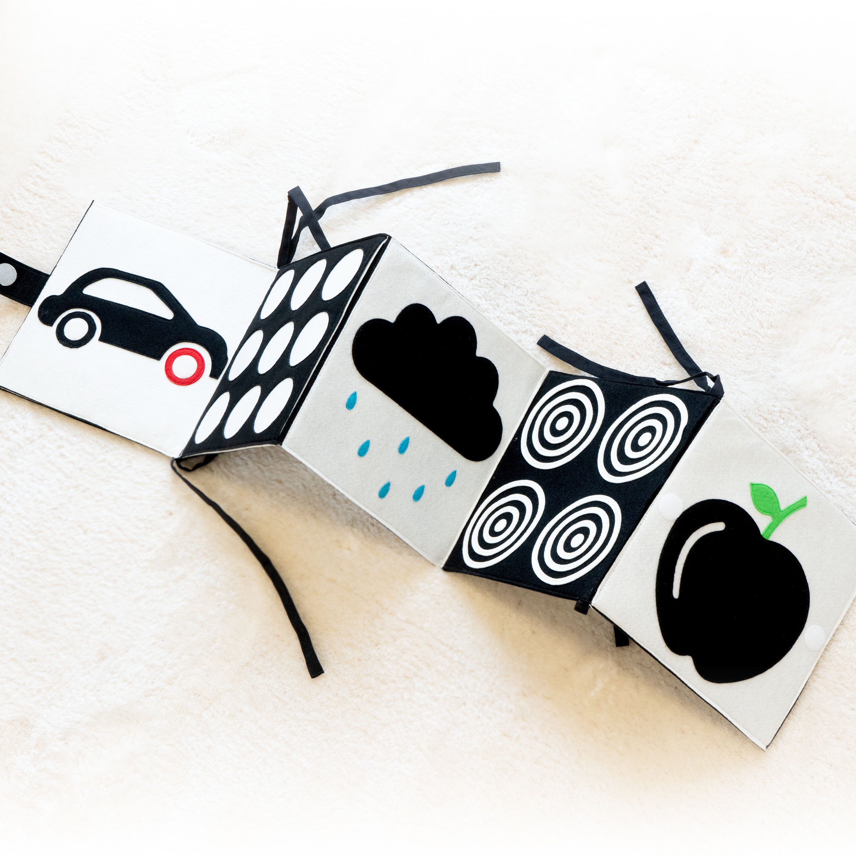 This somewhat repeats the previous point. In addition, individual elements can be removed from the book but are attached to the page with a thread so they don't get lost. There are no sharp edges (like with some paper books) that a blind child could cut themselves on. Because of the felt and fabric design, the pages are not too close together, making them easier to turn the pages. Compared to paper or board books, fabric and felt allow for a new tactile experience. Many interactive experiences are possible with the books, as closures and pockets are incorporated. All in all, the Jolly books offer a wide variety of experiences.