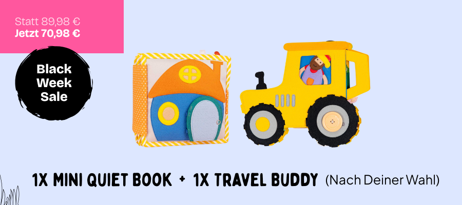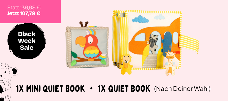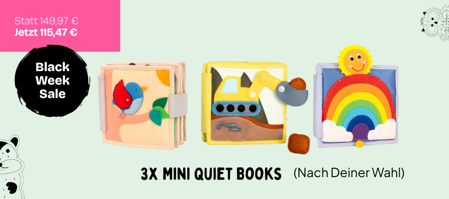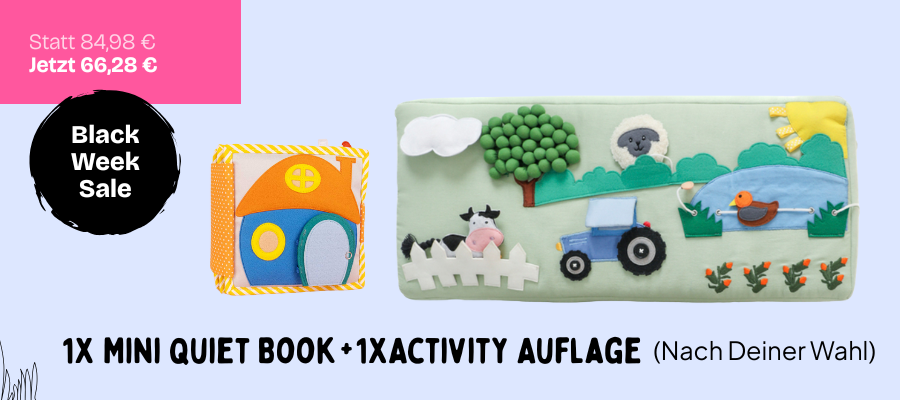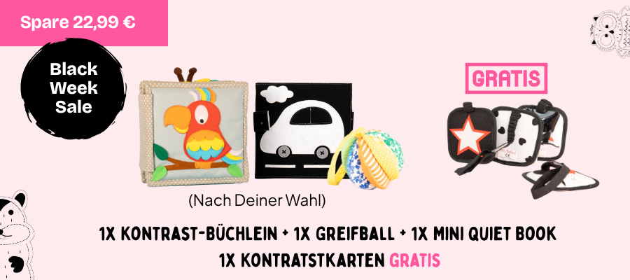 Dieses liebevoll zusammengestellte Baby-Bundle unterstützt die frühesten Entwicklungsphasen: Schwarz-Weiß-Kontraste regen die Sehfähigkeit an und fördern Fokus und Neugier. Der weiche Ball lädt zum Greifen und Fühlen ein, und das Mini Quiet Book ab 4 Monaten bietet erste farbenfrohe Entdeckungen.