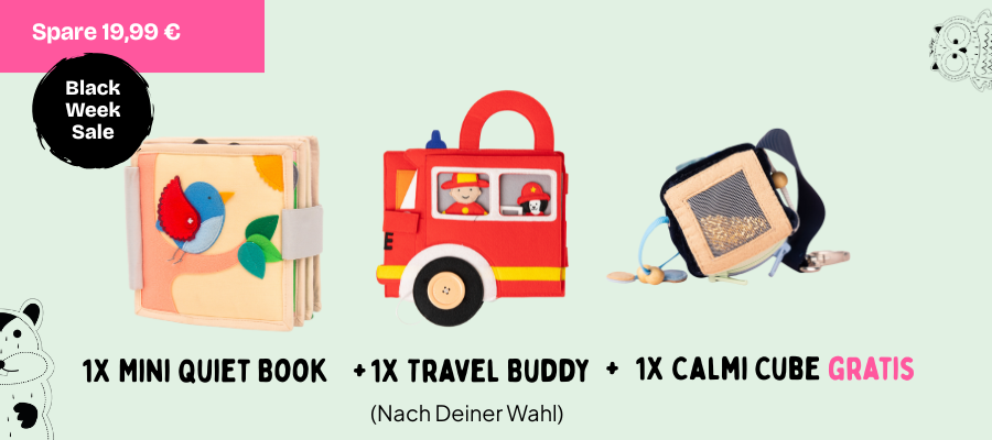 Mini Quiet Book, Travel Buddy et Calmi Cube : le trio compact qui occupe, apaise et stimule votre enfant partout.
