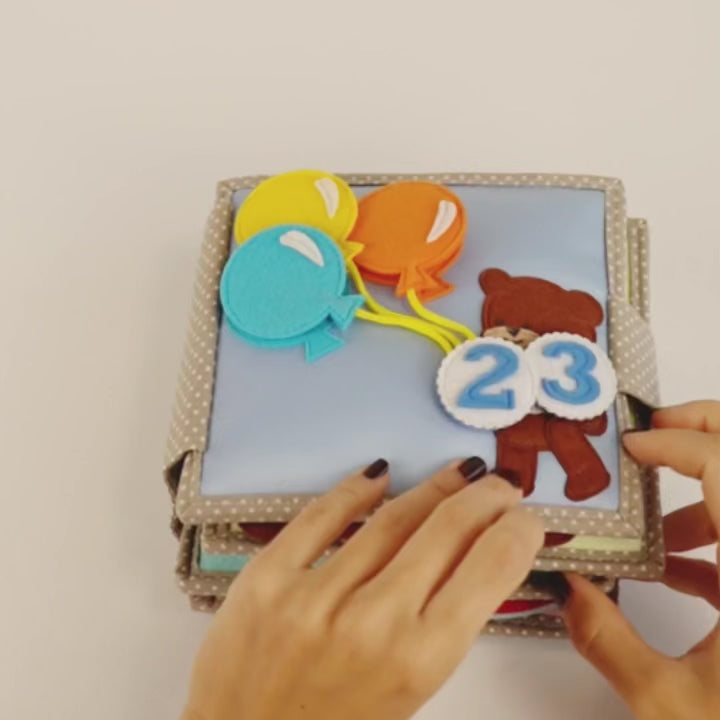 Tout tourne autour du plus beau jour de l’année : l’anniversaire ! Avec le Mini Quiet Book Happy Bearsday, les enfants vivent une fête haute en couleurs. Le petit ours se réjouit de retrouver des ballons, des parts de gâteau, des cadeaux colorés et de délicieuses gourmandises comme des glaces, des donuts et des sucettes.