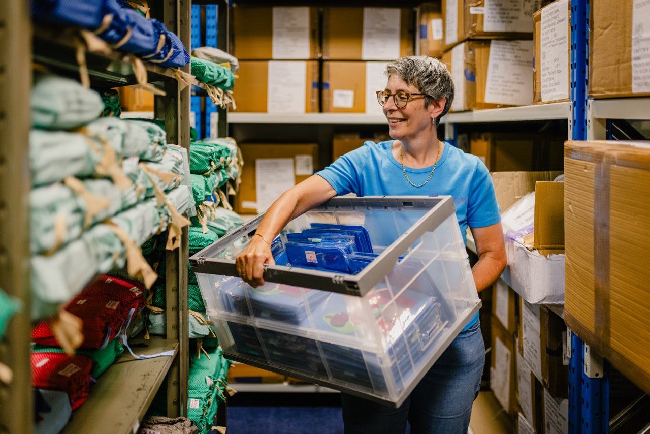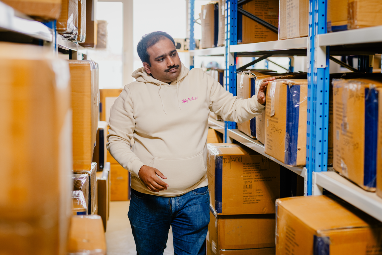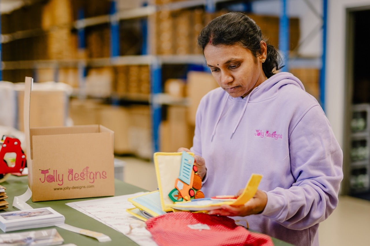 macht mit Iris und Shweta unser Lagerteam komplett. Annapurva hilft fleißig beim Verpacken eurer Pakete und bei der individuellen Personalisierung. Bei großen Anlieferungen unserer Produktion packt sie immer mit an.​