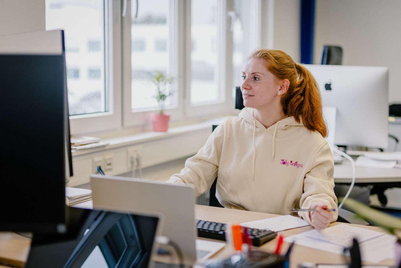ist unsere organisierte Lagerfee. Sie kümmert sich um Anlieferungen, behält den Überblick im Lager und druckt die zahlreichen Lieferscheine für eure Pakete. Mit ganz viel Liebe verpackt sie täglich unsere schönen Jolly Designs Produkte und bereitet sie für den Versand vor.​